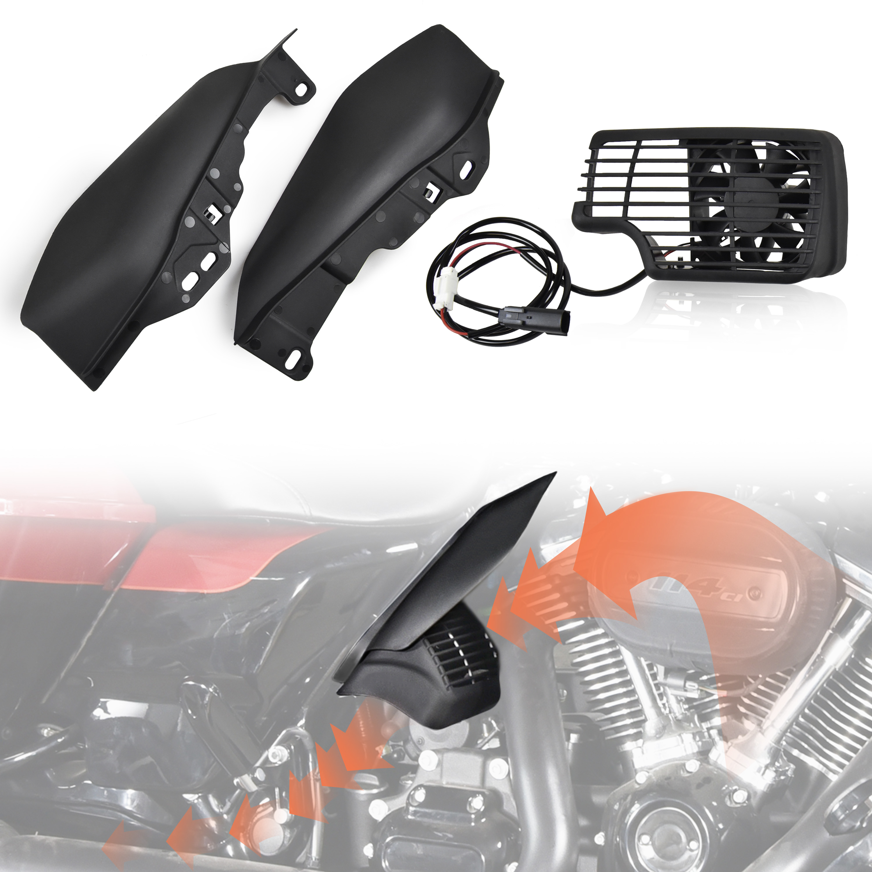 The CoolFlow Fan is engineered to solve one of the most common problems faced by Harley Touring riders: excessive heat from the rear cylinder and exhaust pipe. Unlike traditional fans that blow hot air toward the rider, the CoolFlow system draws heat away from the engine and directs it downward—away from your legs and seat.